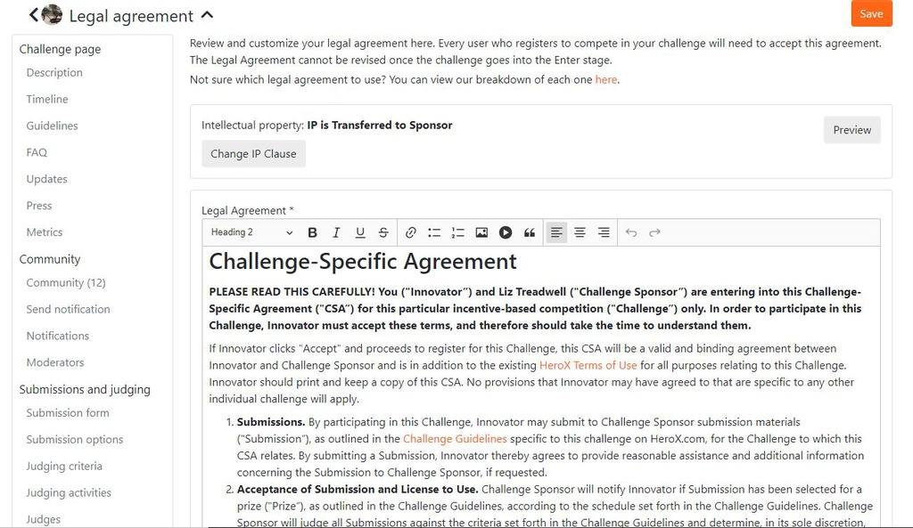 The Legal Agreement section allows you to select the intellectual property structure for your crowdsourcing project and include any additional rules related to it. HeroX provides four template agreements for you to choose from, or you can create your own. To select a HeroX template, click on the “Change IP Clause” button above the text field. A pop-up will display with the four options: